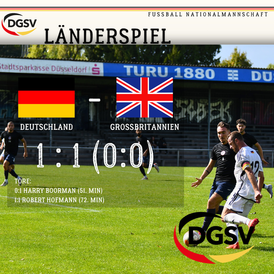 Einen erfolgreichen Länderspielauftakt konnte der neue Trainerstab beim ersten Länderspiel als Nationaltrainer gegen ein starkes Team aus Großbritannien feiern. Am Ende des Spiels stand ein leistungsgerechtes 1:1-Unentschieden, obwohl beide Mannschaften in der Schlussphase noch Chancen zum Siegtreffer hatten. Deutsches Team war mit zahlreichen Spielern (Joel Wansi, Suat Nedzhmi, Kevin Berger und Camilo Seipke) besetzt, die erstmalig das Trikot der Nationalmannschaft getragen haben. Obwohl die Mannschaft in dieser Formation noch nie zusammengespielt hat, fand der Trainerstab gut ins Spiel und hatte auch die ersten Torchancen. Nach einer Kollision zwischen Luca Ballmann und seinem britischen Gegenspieler, bei der sich beide eine Kopfverletzung zugezogen haben, kam einer kleiner Bruch in unser Spiel. Die Briten wurden stärker, ohne sich dabei jedoch große Torchancen zu erspielen. So ging das deutsche Team mit einem 0:0 in die Halbzeit. Nach zahlreichen Wechseln kam es in der zweiten Halbzeit nicht so gut ins Spiel. So ging Großbritannien dann auch durch einen Kopfballtreffer, nach einem Eckball, mit 1:0 in Führung (51. Minute). Im Anschluss daran zeigte das deutsche Team eine sehr gute Reaktion und hatte zahlreiche Chancen zum Ausgleich. Robert Hofmann war es dann, der mit einem sehenswerten Volleyschuss unter die Latte zum verdienten Ausgleich (72. Minute) traf. Beide Mannschaften spielten bis zum Schluss auf Sieg, ein weiterer Treffer sollte allerdings keinem Team mehr gelingen. So endete das Spiel mit einem leistungsgerechten 1:1 Unentschieden. Die deutsche Mannschaft hat auf jeden Fall eine sehr gute Moral und mannschaftliche Geschlossenheit gezeigt. Für die Bundestrainer brachte das Spiel zahlreiche wichtige Erkenntnisse. Aktuell geht es darum, möglichst viele Spieler des Gesamtkaders kennenzulernen und spielen zu sehen. Nur so können die Trainer sich einen Eindruck vom Leistungsniveau der Spieler machen. Nach den gesammelten Eindrücken wollen die Trainer dann in 2026 einen Top-Kader bilden, mit dem sie das klare Ziel verfolgen, eine erfolgreiche Weltmeisterschaft 2027 in Australien zu spielen. Beim Spiel gegen Großbritannien haben zahlreiche Spieler einen guten Eindruck hinterlassen, einige von ihnen konnten sich dabei besonders in den Vordergrund spielen. Das deutsche Team freut sich jetzt auf das Trainingslager im Oktober 2025 in den USA, da wird es weitere wichtige Erkenntnisse und Erfahrungen sammeln.