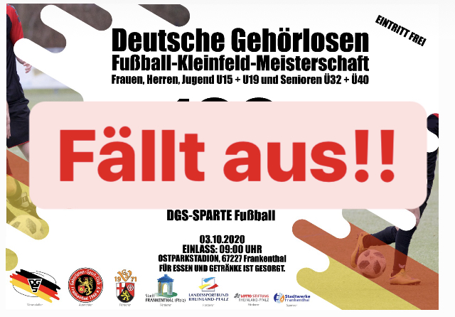leider müssen wir euch mitteilen, dass die Deutsche Gehörlosen – Kleinfeld – Meisterschaft am 03.10.2020 in Frankenthal abgesagt wird.