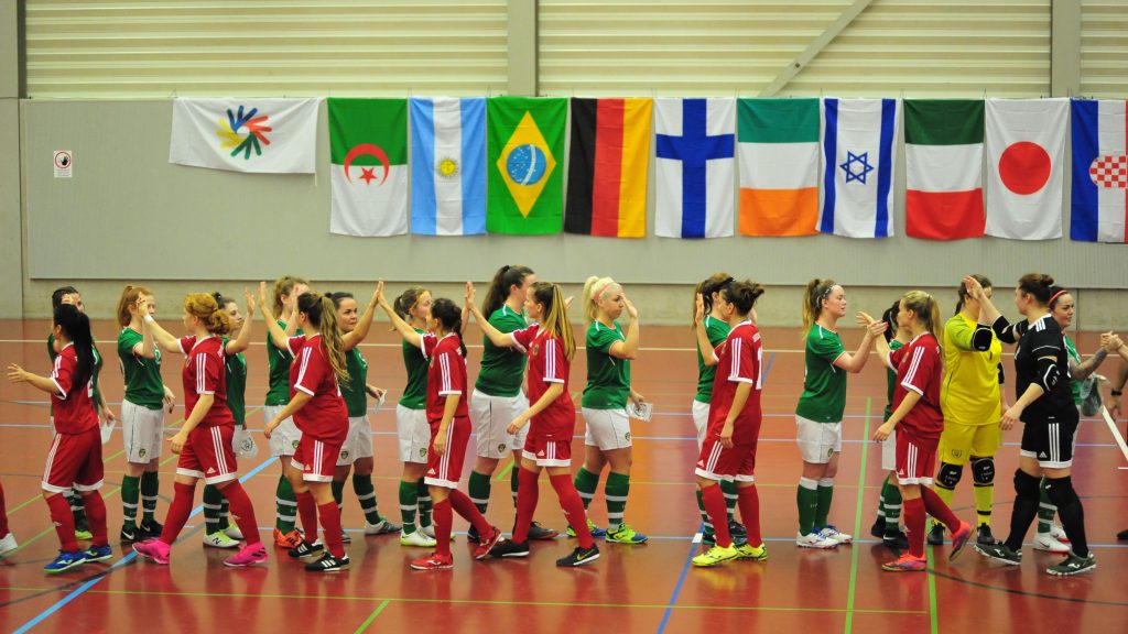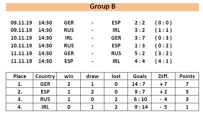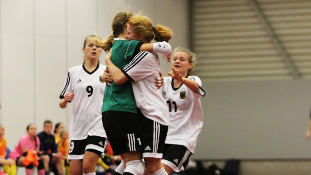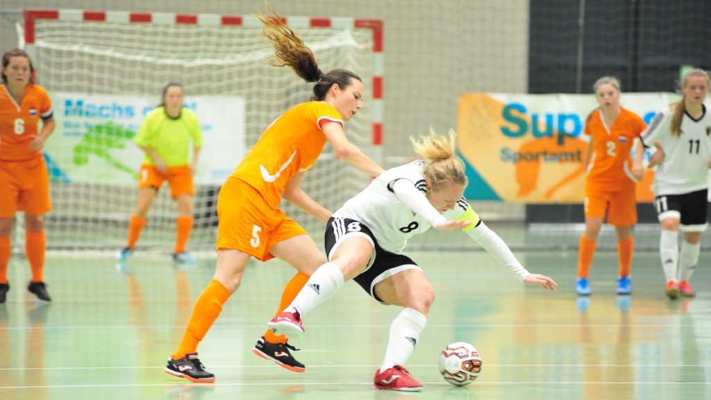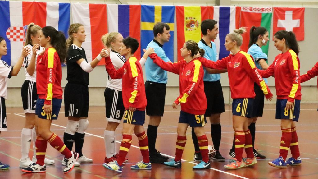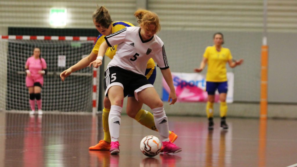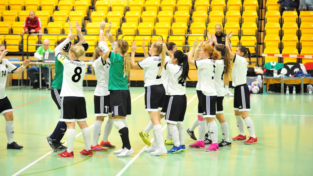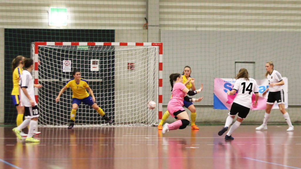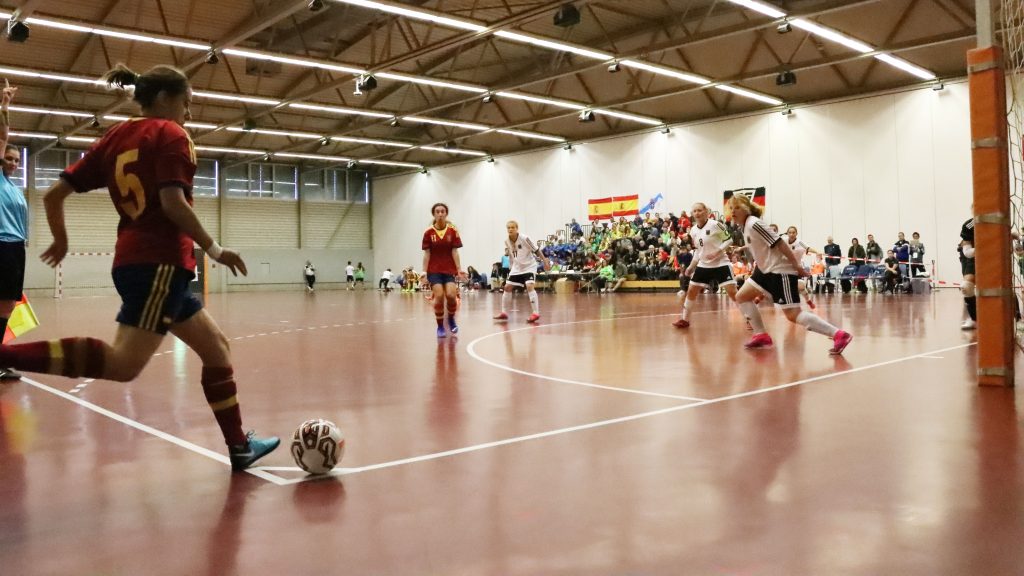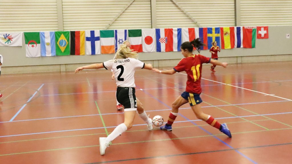 Betreuerstab Diana Aleksic (Delegationsleitung), Benjamin Heymel (Mannschaftsleitung), Fillip Kieffer und Stefan(o) Federico (Bundestrainer), Christin Peemöller (med. Betreuung) 1. Spiel Deutschland gegen Norwegen 16:2 (9:0)Das erste Spiel gegen Norwegen dominierte die DGS Auswahl von der ersten Minute an. Bereits zur Halbzeit führte die Manschaft mit 9:0 und am Ende 16:2. Ein sehr guter Start in die Futsal-Europameisterschaft. 2. Spiel Deutschland gegen Irland 8:5 (4:5) Gegen Irland am Folgetag tat sich die Mannschaft in der ersten Halbzeit schwer, schnell erspielten sich die Irinnen einen 3:0 Vorsprung, dann hat die junge Nicole Ilzhöfer einen Lauf, gleich viermal hinter einander versenkte sie den Ball im gegnerischen Tor, Irland holte erneut zum 5:4 auf, dann in der zweiten Halbzeit bekamen sie keine Chance mehr, Deutschland gewann mit 8:5. 3. Spiel Deutschland gegen Spanien 5:5 (3:3) Das dritte Spiel gegen Spaniens Auswahl wurde erwartungsgemäß das härteste. In einem von Anfang an sehr ausgeglichenen Spiel auf hohem Niveau hatten die Deutschen Mühe mit dem schnellen Umschaltspiel der Spanierinnen. Deutschland musste das Spiel gewinnen, um als Gruppensieger in die KO Runde zu kommen. Aber egal, welche der beiden Mannschaften führte, immer wieder fiel der Ausgleich, am Ende blieb es beim 5:5 und mit einem Tor mehr in der Gesamtbilanz lag Spanien damit vorn in Gruppe B.