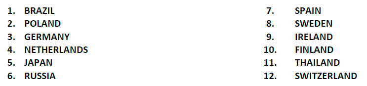 Teilnehmende Länder Gruppe A – Brasilien, Niederlande, Schweiz, Thailand Gruppe B – Deutschland, Irland, Russland, Spanien Gruppe C – Finnland, Japan, Polen, Schweden