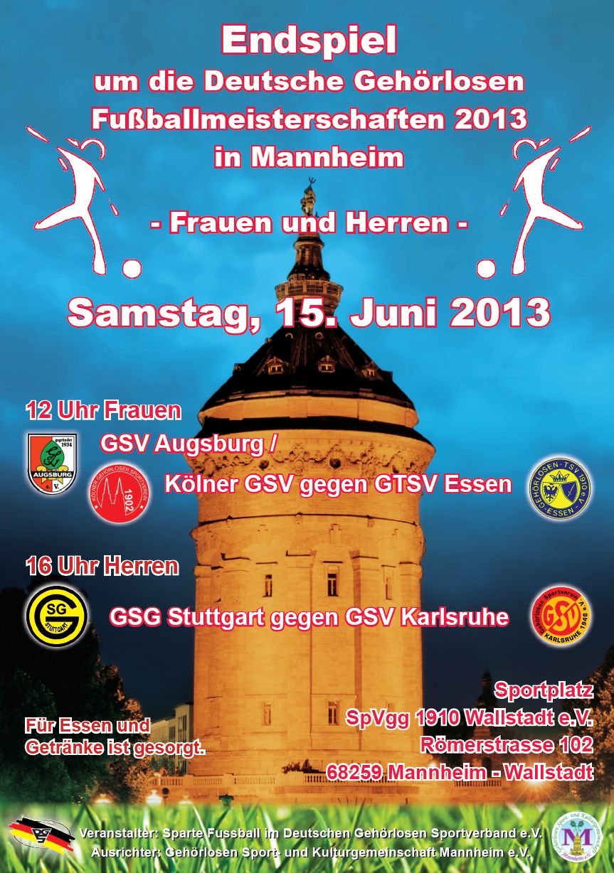 Am kommenden Samstag, 15. Juni finden zwei große Fußballendspiele der DG-Meisterschaften der Herren und Frauen auf dem Rasenplatz der SpVgg Wallstadt, Römerstr. 102 in Mannheim-Wallstadt statt.
