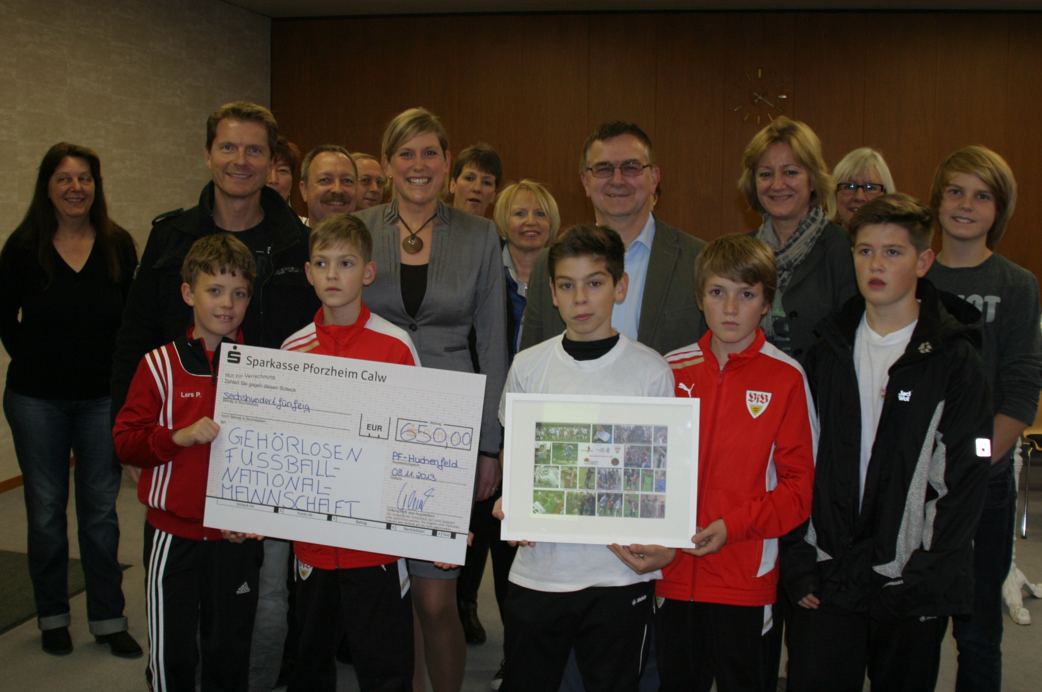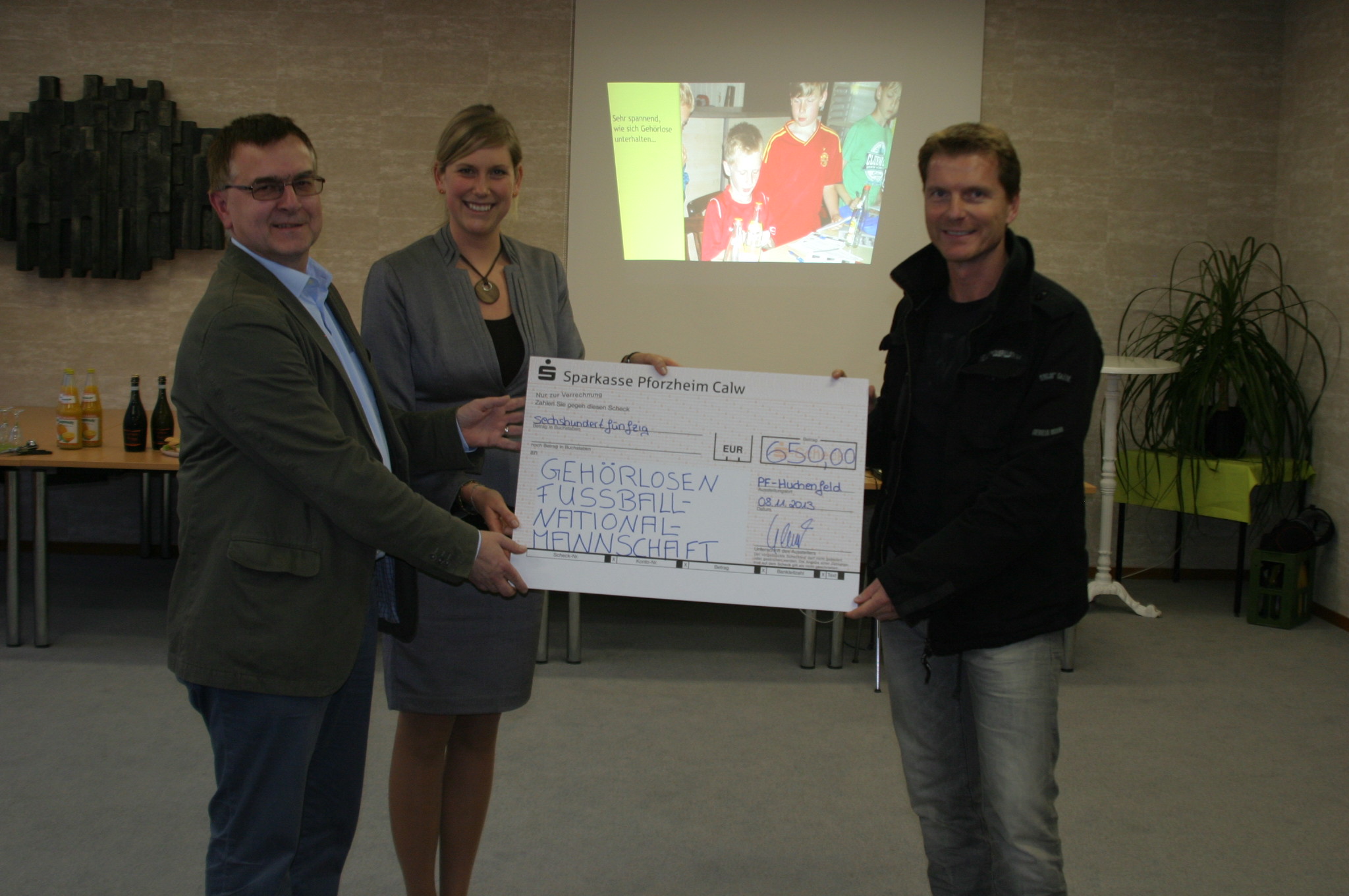 Wie wir schon des Öfteren berichtet haben, fanden in diesem Jahr mehrere Veranstaltungen von kicken&lesen statt. Im Sommer besuchten die Lesekicker, Sabine Gebhart (Schirmherrin des Projekts) sowie Vertreter des Leseforums und des SV-Huchenfeld die Deutsche Gehörlosen-Nationalmannschaft auf der Sportschule Schöneck. Auf der Rückfahrt beschlossen wir, der Mannschaft finanziell unter die Arme zu greifen, denn die Spieler müssen für Ihre Anreise zu einem Fußballspiel selbst die Kosten tragen und Urlaubstage dafür opfern.