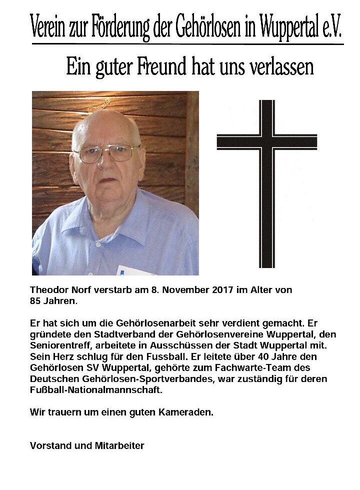 Wir sind tief betroffen und in Gedanken bei seiner Familie und seinen Freunden. Unser Theodor Norf war damals bei uns als Deutscher Gehörlosen Fussballwart tätig und sowie auch als GSNRW – Fußballwart.