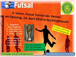 Fussball-4. Fustal Turnier am 14. April 2018 in Recklinghausen 24. Januar 2018 Webmaster Fussball-4. Fustal Turnier am 14. April 2018 – Einladung und Anmeldung – Deutsch Vereins Events