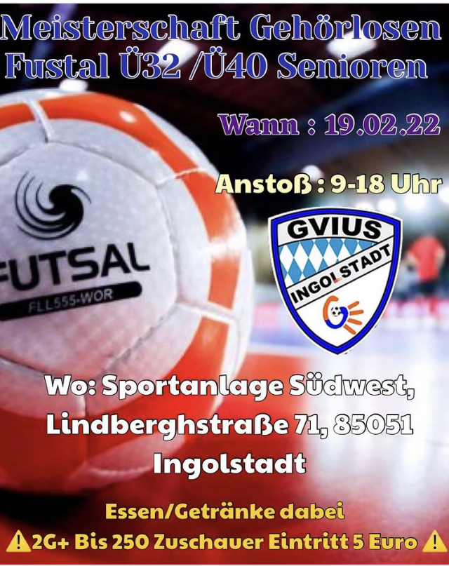 Deutsche Gehörlosen Futsal-Meisterschaft der Senioren Ü32 / Ü40 am 19.02.2022 in Ingolstadt 17. Februar 2022 Technischer Leiter Folge uns auf Facebook, Instagram, YouTube und Twitter. Facebook Instagram YouTube Twitter HINWEIS: Aktuell werden nur 100 Zuschauer zugelassen! DFM2022-Spielplan-Uebersicht-Senioren-Ue32-und-Ue40Herunterladen DFM2022-Spielplan-Senioren-Ue32Herunterladen DFM2022-Spielplan-Senioren-Ue40Herunterladen DFM2022-Durchfuehrungsbestimmungen-IngolstadtHerunterladen DM - Senioren - Futsal
