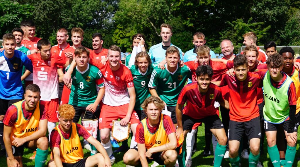 Kurz darauf jedoch der Ausgleichstreffer durch die Tschechen nach einem unglücklich verursachten Elfmeter. Die Jungs gingen dann mit dem Unentschieden in die Pause. Gegen die körperlich deutlich überlegenen Tschechen gaben sie nicht auf und spielten weiter mutig nach vorne. Durch ein paar eintrainierte taktische Dinge kamen sie immer stärker ins Spiel und hatten viel Ballbesitz. Dies verunsicherte die Tschechen nach und nach, bis die Jungs in der 56. Minute durch Hamburger Noah Bolz die Führung erzielen konnten. Die Führung haben sie danach stark gehalten und gewannen dieses Länderspiel somit verdient mit 2:1.