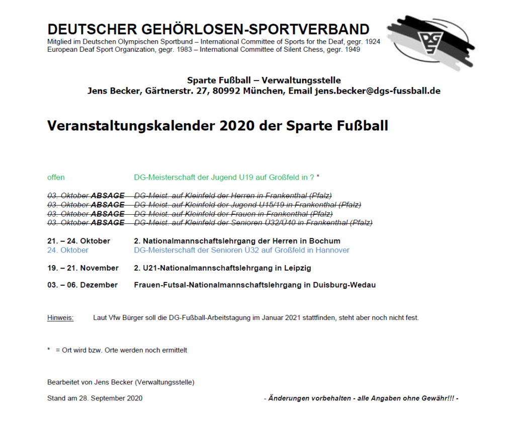 - Die Regionale Gehörlosen Meisterschaften der Herren (Nordost, NRW, Südwest) in der Saison 2020/21 werden abgesagt. Die Region Bayern wird sich eine eigene Lösung überlegen.