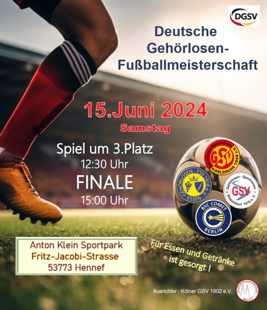 anbei die Ausschreibung für die Deutsche Gehörlosen Kleinfeld-Meisterschaft Herren und Frauen am 29.06.2024 in Bielefeld.