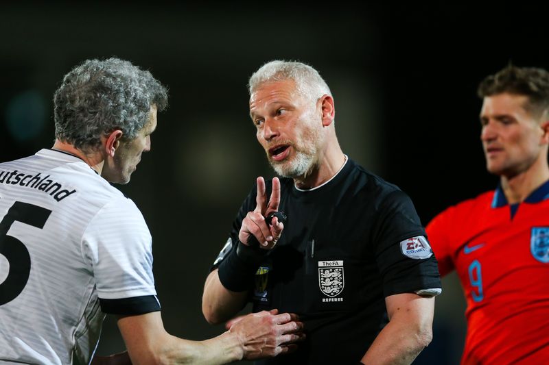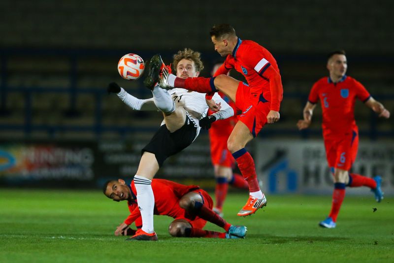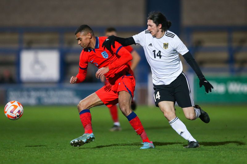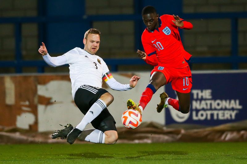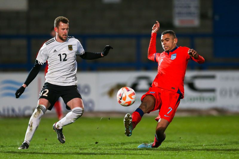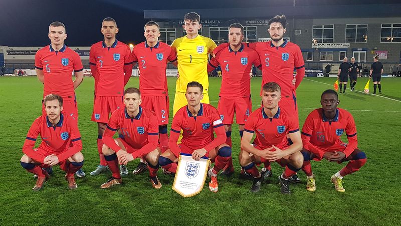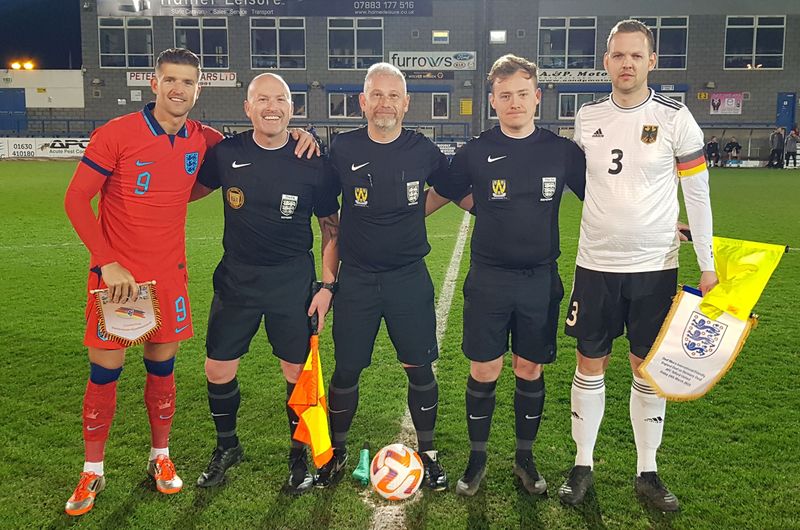 Am Freitag, den 24.03.2023, wurde um im New Bucks Head, dem Stadion des AFC Telford United, angepfiffen; das Spiel endete mit einem 3:0 Sieg der Gastgeber. England gab in den ersten 20 Minuten gleich den Ton an und zeigte, wer der Herr auf dem Feld war, fast alle Zweikämpfe gingen an die Gastgeber, sie spielten dominant, teilweise fast schon übermotiviert. Unglücklicherweise mussten nach sehr körperbetontem Einsatz Medewitz und Plank frühzeitig verletzungsbedingt ausgewechselt werden. Durch die Tore von Kapitän Jamie Clarke und Abou Jobe nach Standards und individuelle Fehler der Deutschen brachte sich England bereits nach zwanzig Minuten in eine 2:0 Führung. Danach kam die deutsche Mannschaft besser ins Spiel. Trotzdem konnte Clarke einen erneuten Stellungsfehler zum 3:0 nutzen. Ryan Casey sah noch in der ersten Halbzeit rot und wurde vom Platz verwiesen.
